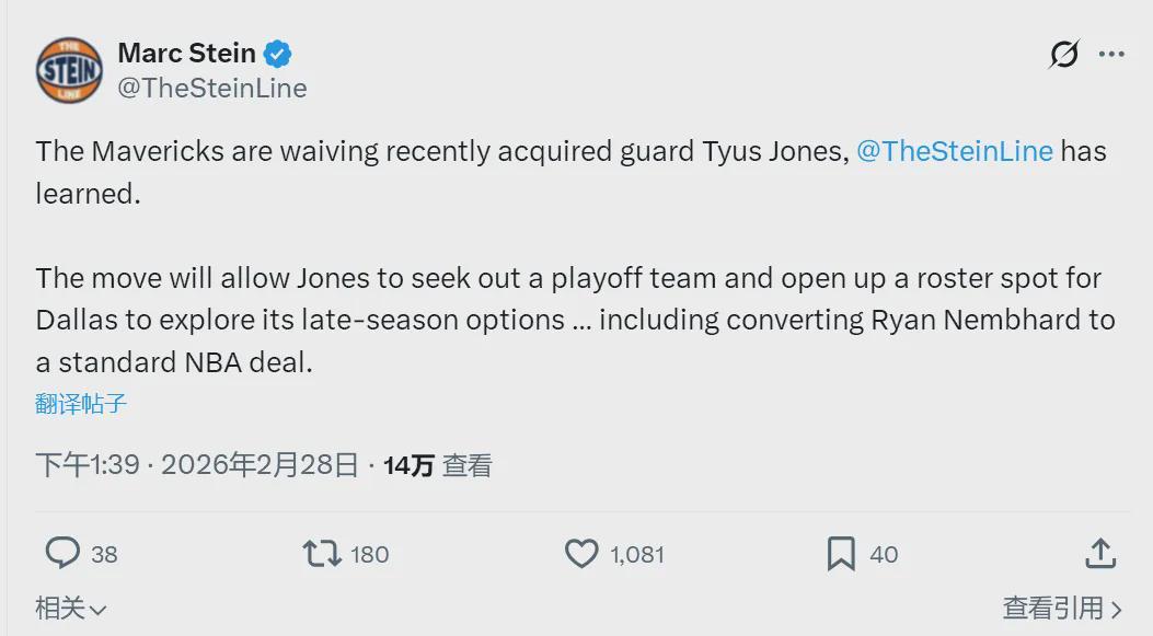 北京时间2月28日,据NBA名记Shams报道,太阳正式裁掉了后卫科尔-安东尼。由于科尔-安东尼在3月1日之前被裁,他有资格代表新球队出战季后赛。但是截至目前,还没有球队表达兴趣。同样是今天,独行侠裁掉了泰厄斯-琼斯。