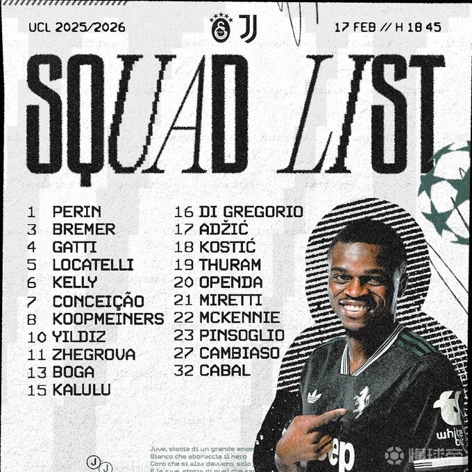 北京时间2月16日,尤文官方公布欧冠淘汰赛附加赛首回合客战加拉塔萨雷的大名单,凯夫伦-图拉姆回归,戴维、霍尔姆缺阵。