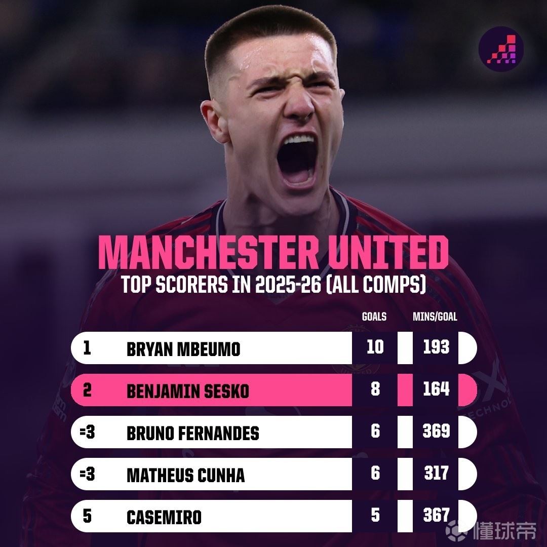曼联队内本赛季射手榜及进球效率