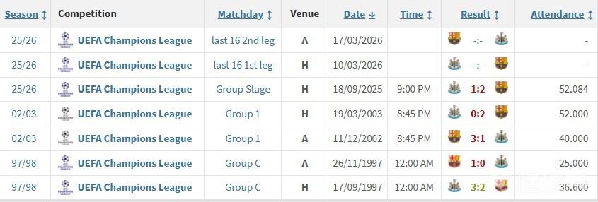 02-03双方再次在小组赛相遇,巴萨主场3-1、客场2-0双杀了纽卡,巴萨最终小组头名出线,纽卡则小组第三出局,不过巴萨在8强中两回合2-3遭到尤文淘汰。