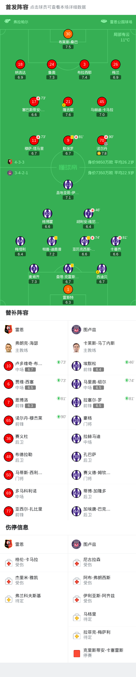 雷恩1-0图卢兹,诺尔丹打进全场唯一进球