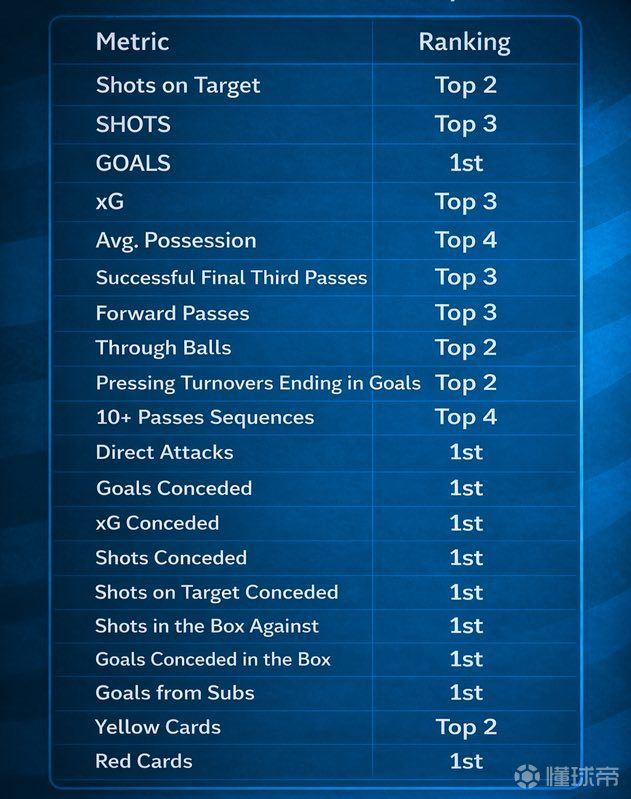 阿森纳目前19胜7平3负积64分高居榜首,领先少赛一场的曼城5分,争冠战意极其强烈。 附2025/2026赛季阿森纳关键数据指标英超排名!本赛季阿森纳在几乎所有主要数据指标中都位居榜首或接近榜首,从进球数到防守统治力全面领先。有趣的是,当数据清晰展现控制力、统治力和稳定性时,媒体却对此闭口不谈——只因这些事实不符合他们预设的叙事框架。[数据来源:@OptaAnalyst]