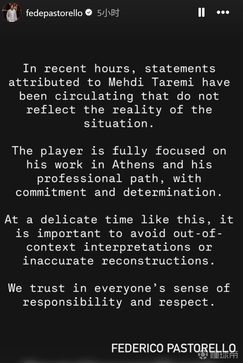 帕斯托雷洛表示:“近日流传的一些所谓塔雷米的言论,并不符合事实。球员目前完全专注于自己在雅典的工作与职业道路,保持承诺与决心。在这样一个敏感时期,避免断章取义或不准确的重构尤为重要。我们相信各方都能秉持责任感与尊重。”