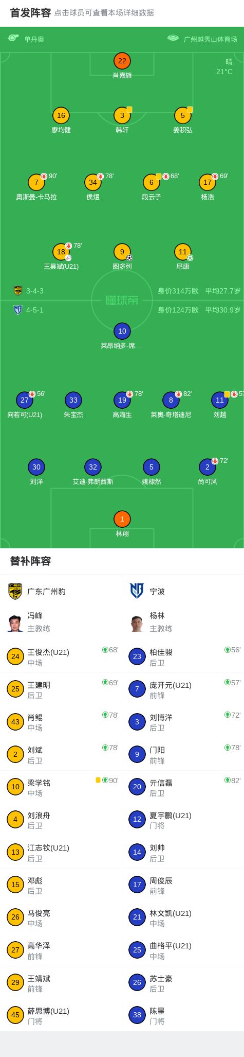 北京时间3月14日中国足球甲级联赛 联赛 第1轮,广东广州豹主场对阵宁波。广东广州豹尼康破门,图多列破门。最终比分广东广州豹 2-0 宁波。