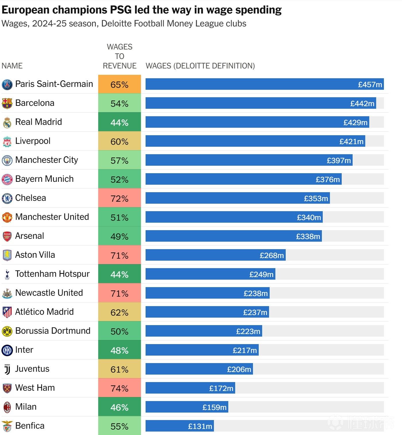 在这11家俱乐部中,只有阿森纳、曼联、桑德兰,或许还有曼城,可以声称因为去年夏天的引援而变得更强大。热刺、诺丁汉森林和西汉姆联都在为保级而战。在工资方面,英超俱乐部也占据了支出最高名单的主导地位。